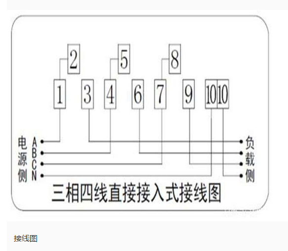 三相預(yù)付費(fèi)電表直接式的接線比較簡單,編號從1到10,有的朋友只看到底部的7個接線柱,其實(shí)還有2、5、8三個接線柱,只不過這三個接線柱和147用連接片短接了,所以不需要再接線。這種直接式的三相四線電表的接線順序是:147接三相電源的進(jìn)線,369接出線,最后的10接進(jìn)出的零線。